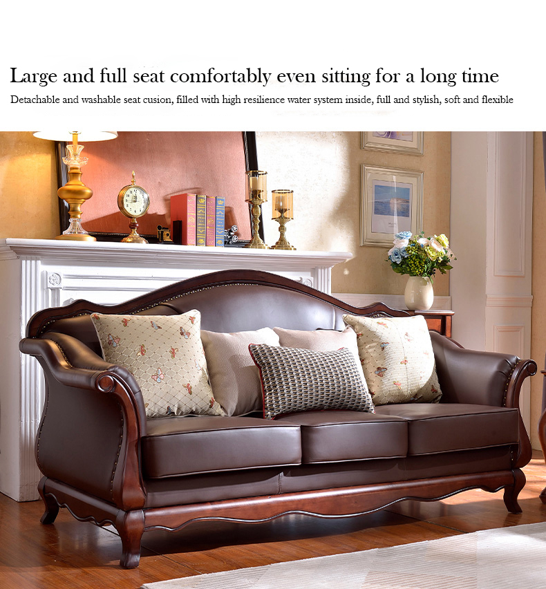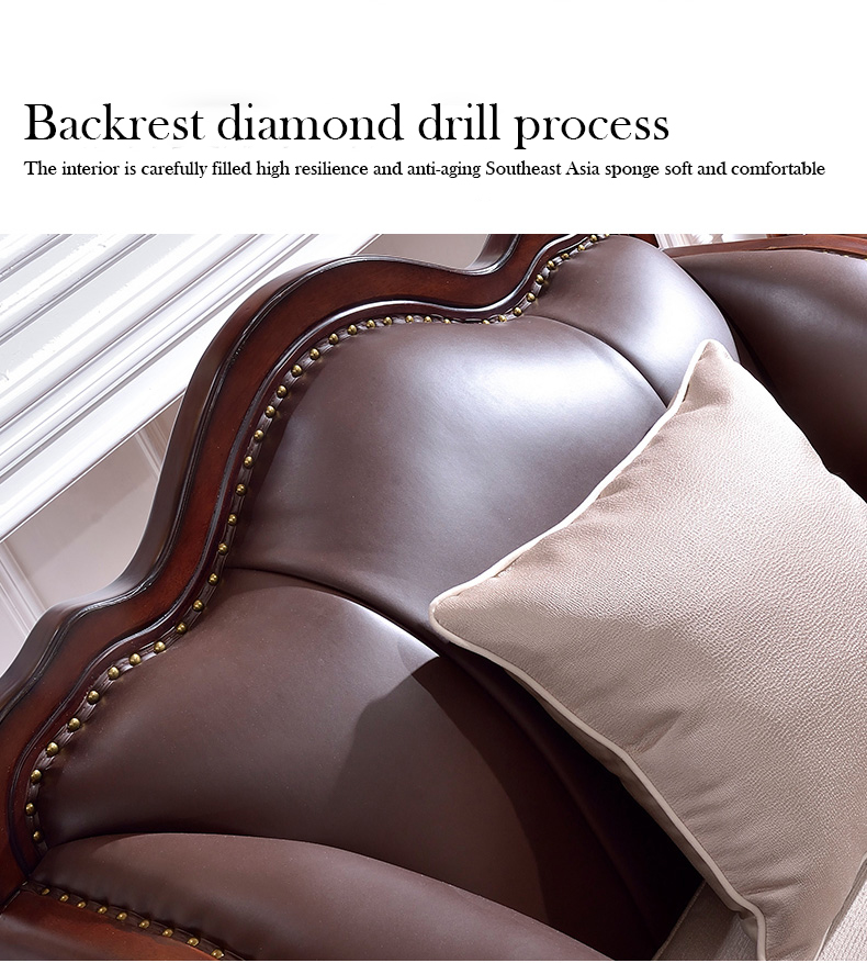 As can be seen, With the diamond drill process on the back, it makes the seats on the sofa very strong and sturdy and adds to the firm and beautiful impression. In addition, Gold color from nails and brown finishing color and matching upholstery color adds to the beauty of the American Retro Sofa. The interior is presented with great care in the manufacturing and installation process as well as the selection of soft foam materials, high water resistance on the seat surface and always prioritizes comfort.