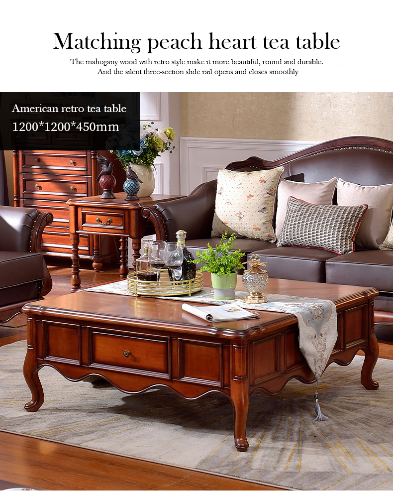 American Retro Tea Table is a set from American Retro Sofa. It feels incomplete if there is a sofa and no table. With Mahogany wood, its quality and durability make the American Retro Tea Table look solid. With the same finishing color and in line with the American Retro Sofa, this sofa and table set has a thicker Retro atmosphere and is beautiful to look at.